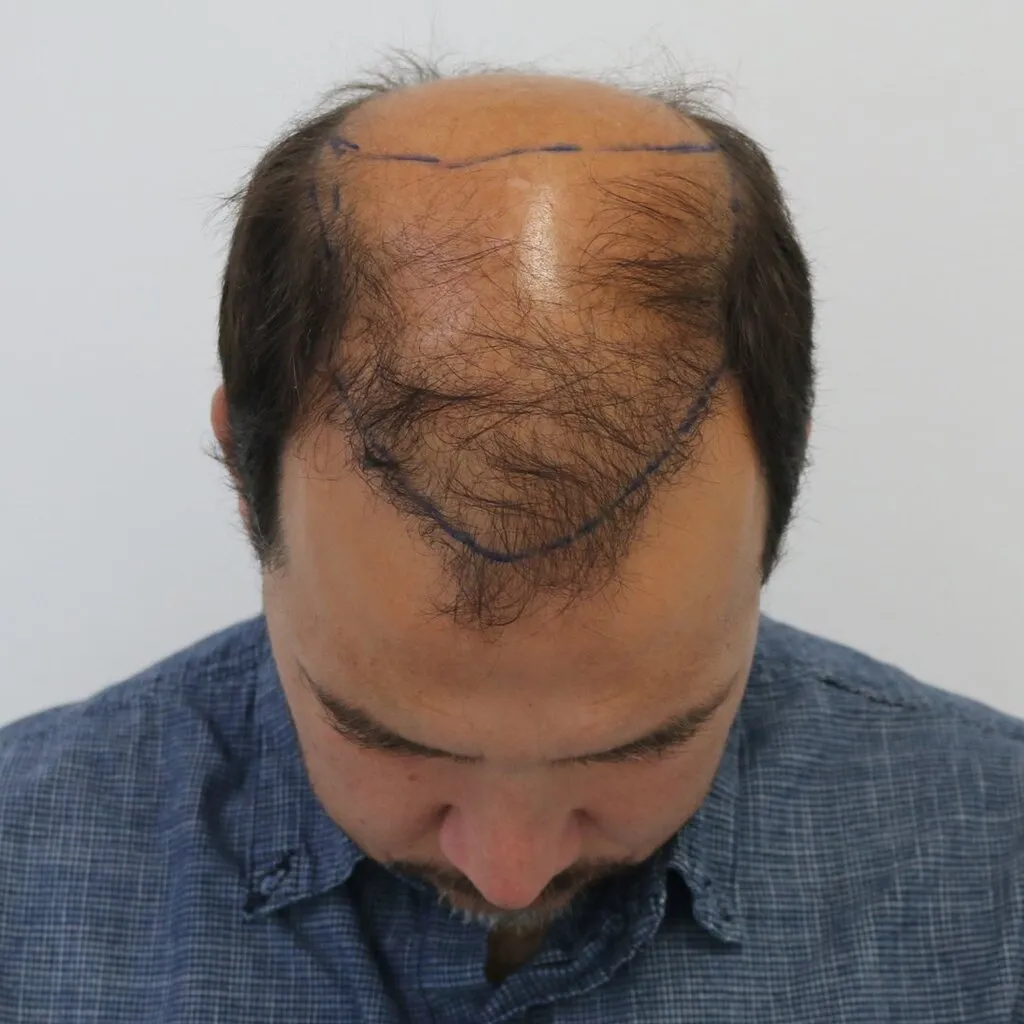 The patient came to our clinic with a complaint of male pattern baldness. On clinical examination, there was marked balding in the frontal hairline, mid-scalp, and crown areas. Thus, to utilize the grafts efficiently, we have planned a two-session surgical intervention for the patient. Our aim is to provide natural and permanent hair follicle surgery.